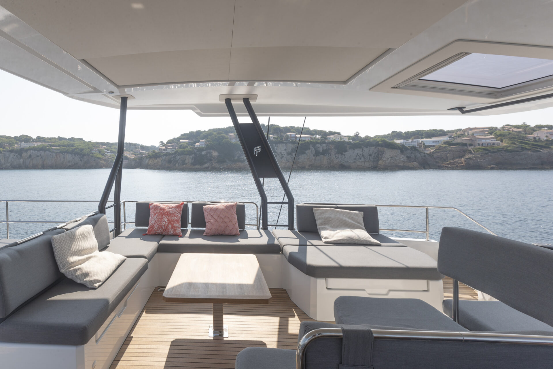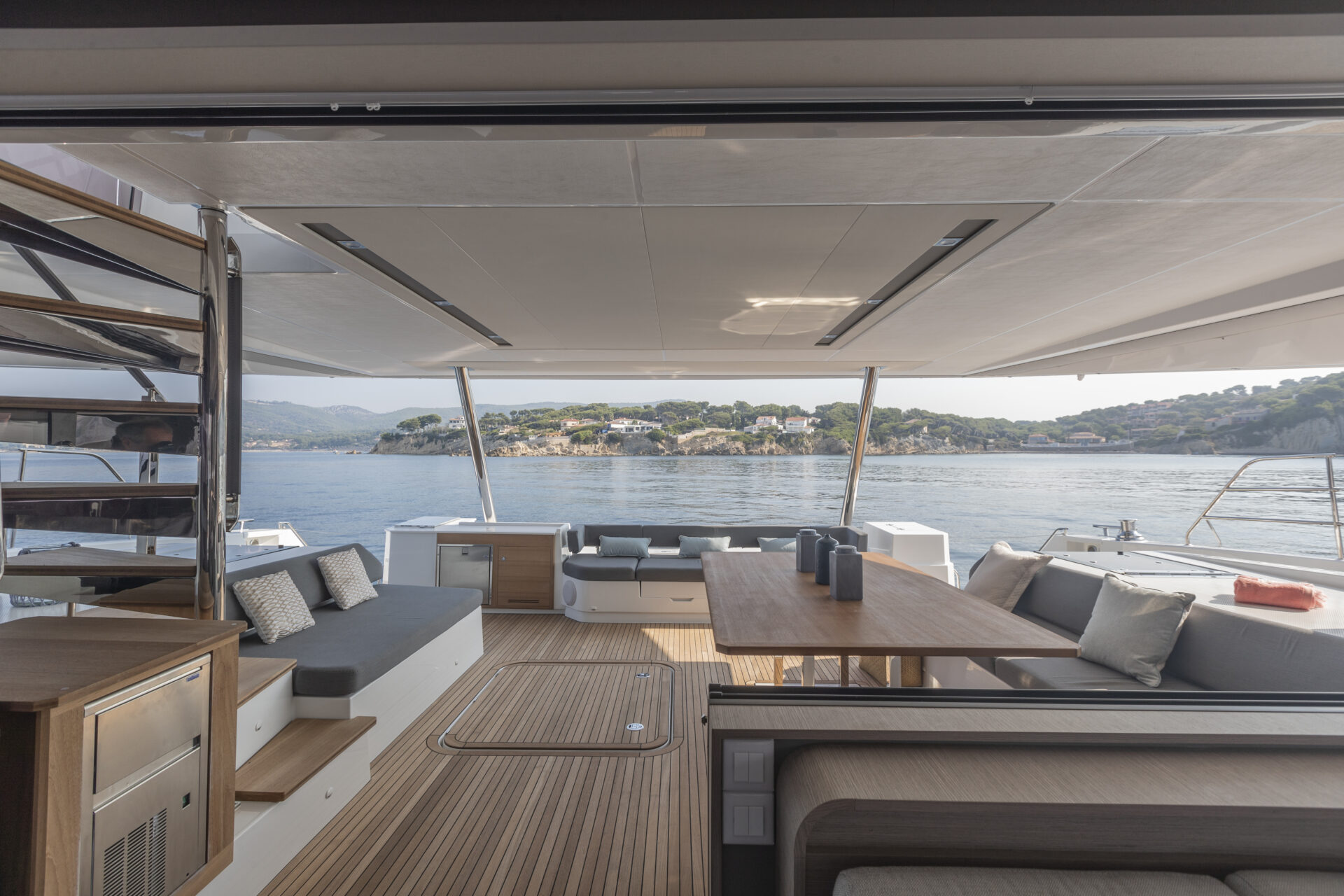 The large cockpit offers 27.5 sqm of convivial space. There are 3 seating areas, and a generous dining table for 10/12 guests. It can also feature an optional galley and plancha.