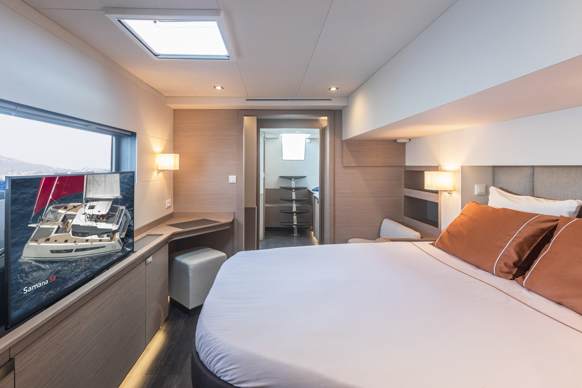 The owner’s cabin (in the Maestro version) enjoys a double access, both from the saloon and from the aft cockpit.
